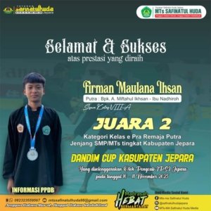 1. Firman Maulana Ihlas (Kelas VIII-A) putra dari Bpk A. Miftahul Ihsan – Ibu Nadhiroh berhasil meraih Juara 2 (Medali Perak) Kategori kelas e Pra Remaja