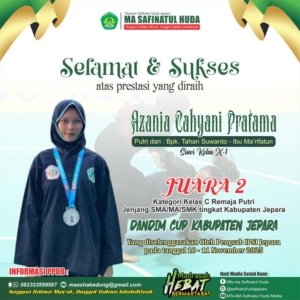 2. Azania Cahyani Pratama (Kelas X-1) putri dari Bpk Tahan Suwanto – Ibu Ma’rifatun berhasil meraih Juara 2 (Medali Perak) kategori kelas C Remaja Putri