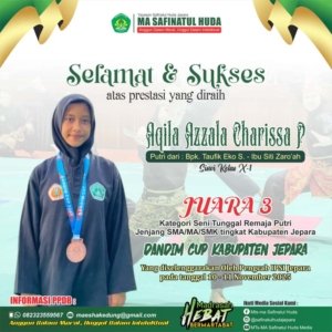 3. Aqila Azzala Charissa Putri (Kelas X-1) putri dari Bpk Taufik Eko Supriyanto – Ibu Siti Zaro’ah berhasil meraih Juara 3 (Medali Perunggu) kategori Seni Tunggal Remaja Putri